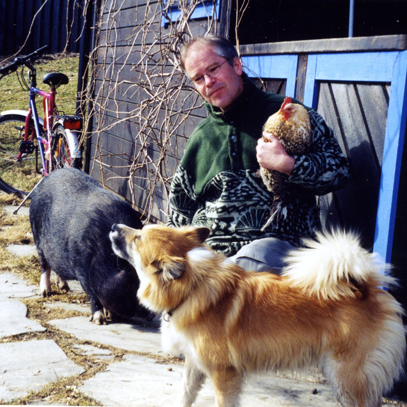Vi har kanariefugle, hund og høns, naboen har gris og hest. Suppehøna, som jeg sidder med, fylder 11 år. Anne-Grete fik den da hun fyldte 40 år, altså er hun ganske gammel hun også.